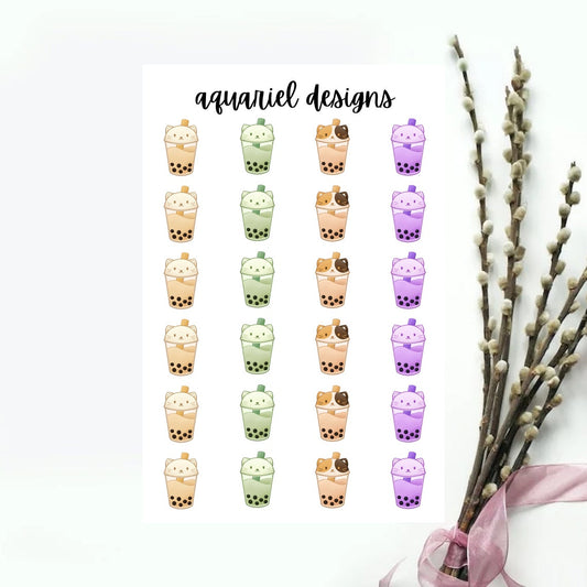 Boba Cat Stickers, 24 Boba Cat Stickers for Planners, Calendars, Bullet Journals, etc.