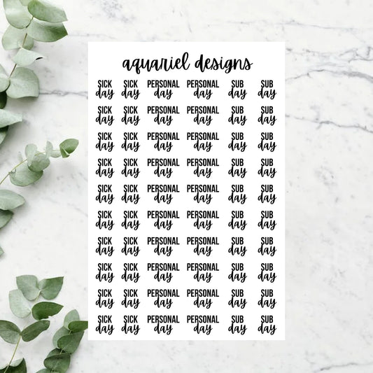Teacher Sick Day, Personal Day, Sub Day Planner Stickers for Planners, Calendars, Bullet Journals, etc.