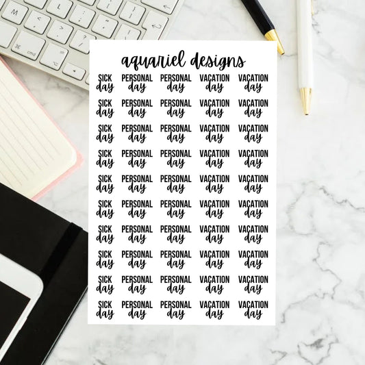 Sick Day, Personal Day, Vacation Day Planner Stickers for Planners, Calendars, Bullet Journals, etc.