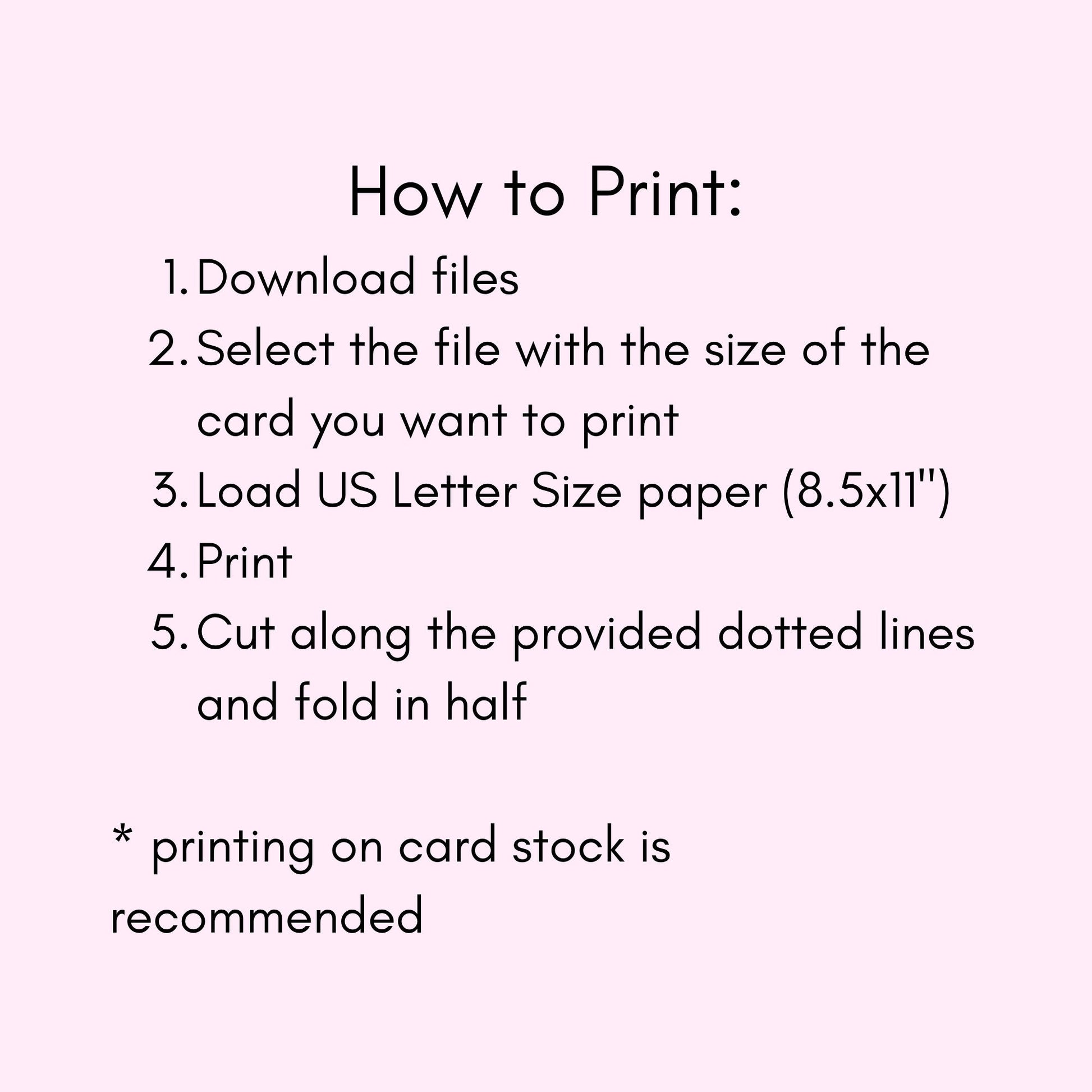 • 4.25”x5.5“ foldable card. Prints one per page. Fits standard A2 envelope