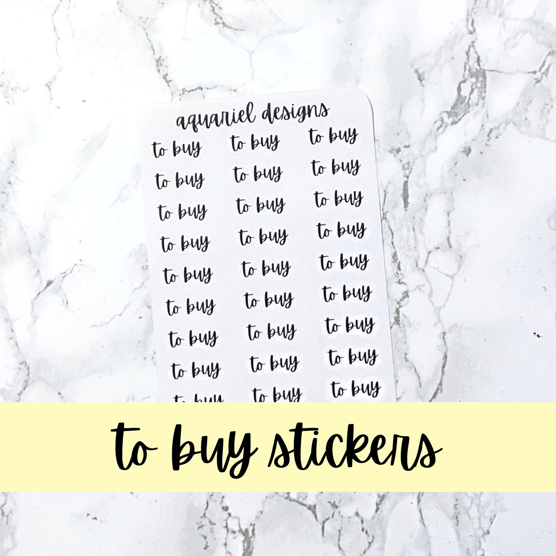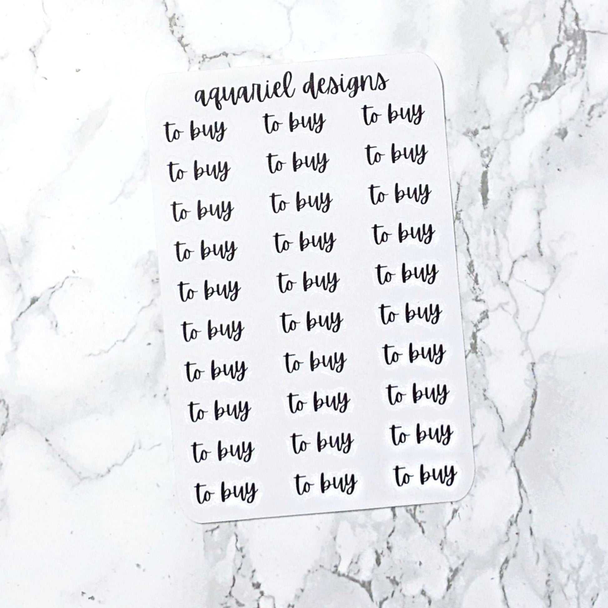 The To Buy sticker sheet includes 30 "to buy" stickers on each sheet in a cursive font.